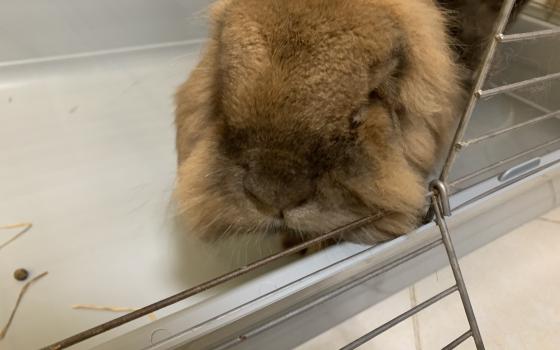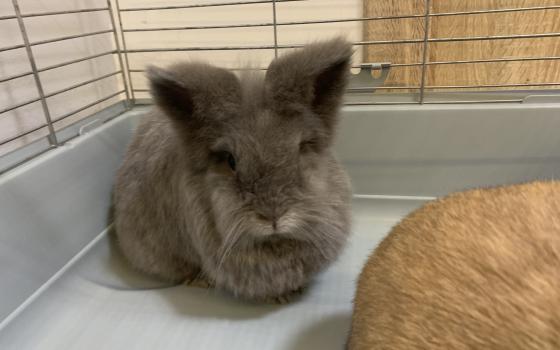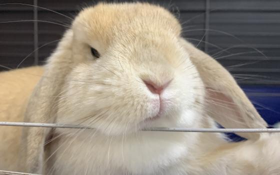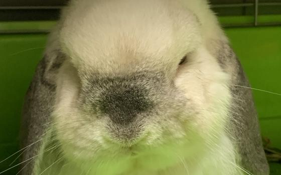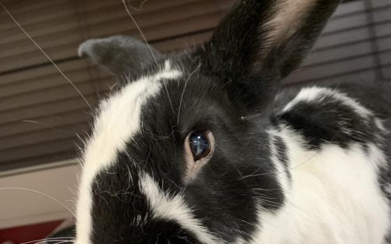 Bingo to duży, czarno-biały samiec o absolutnie gigantycznych uszach, które prawdopodobnie odbierają sygnał z sąsiedniego województwa. Nie jest królikiem hodowlanym, ale rozmiarami potrafi zaskoczyć...